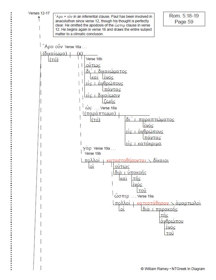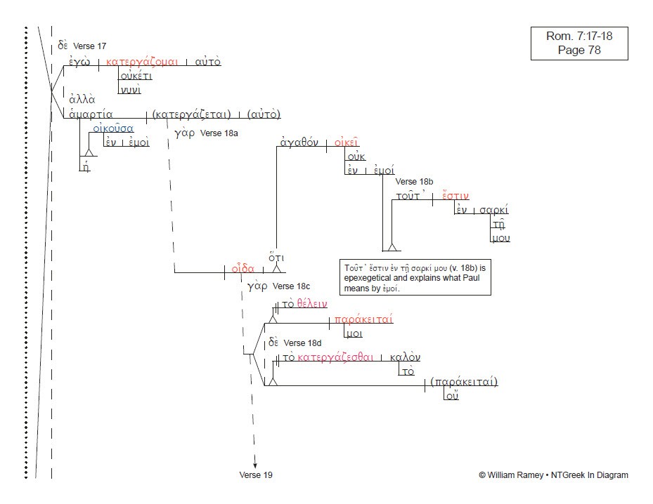 Paul's thought flow and syntax throughout this grand letter requires careful analysis. His style of placing the main verb at the beginning of declarative clauses and after the connecting particle is predominate (e.g., 1:11, 13, 16, 18, 21, 22, 24, 26, 28,etc.). However, in some cases, the subject precedes the verb (e.g. 1:17, 19, 20, etc.). Paul frequently places the adjective or adjectival phrase after the noun with the repeated article. Furthermore, the Epistle to the Romans is an excellent example of Paul's protracted sentence structure. For example, from Romans 1:1--5:11, there are 117 main verbs and 80 subordinate verbs. This causes the sentences to become rather long and thus more "literary" than anything in Luke & Acts.